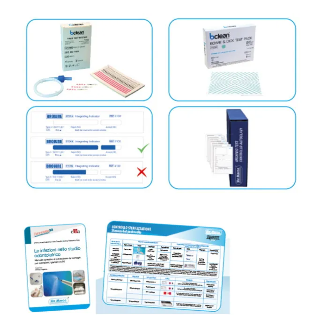 Kit completo Test Monitoraggio Sterilizzazione Autoclave contenente: “1 conf. HELIX TEST BCLEAN (1 dispo -sitivo + 250 indicatori); 2 conf BOWIE&DICK BCLEAN (10 pacchi prova cad.) 1 conf. TEST BROWNE 3100 (250integratori di avvenuta sterilizzazione e 1 Raccoglitore per archivio test.